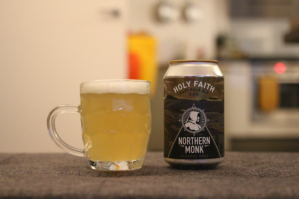 From those humble beginnings Northern Monk are now arguably one of the most recognisable craft beer brewers in the UK, with their wares available in the trifecta of big supermarkets – Tesco, Sainsbury’s, and Morrisons. They’ve helped many smaller brewers get a foot on the ladder via their brewing facilities, including the ever-popular Mash Gang. However, as far as I know the brewer has only released a single non-alcoholic beer under their own label. Holy Faith was released in January 2021, the result of over a year’s work on the ins and outs of 0.5% ABV brewing. The brewer has used Citra Cryo and El Dorado hops in the brew, known for a slew of tropical and citrus aromas, along with other fruits such as watermelon and stone fruits. Has the brewer’s year of hard graft in the research and development department paid off in the flavour department without relying on any alcohol to prop it all up?